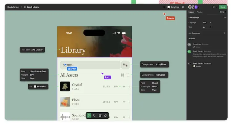 Za programere, Figma nudi Dev Mode gdje mogu pregledati dizajn, dobiti CSS, iOS ili Android isjechke koda te razumjeti specifikacije dizajna izravno iz datoteke dizajna. Ova znachajka premoshchuje jaz između dizajna i razvoja, osiguravajuchi da ono shto je dizajnirano moze biti precizno napravljeno u produkciji.