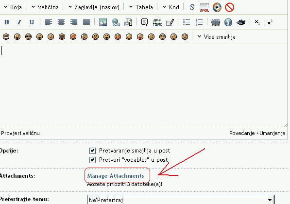 Sada napises post te dole ispod posta imas opciju Manage Attachments prikazano na slici 2.