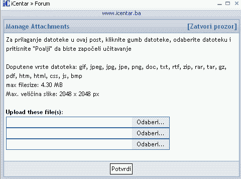 2. Sliku direktnom metodom zakacite na svoj post uz pomoc Manage Attachments opcije tako sto kliknete na Manage Attachments, odaberete putanju do slike a zatim kliknete Chose. Nakon toga na svojem postu kliknete Potvrdi. Na forumu ce se prikazati post sa slikom. Dodatni tab Manage Attachments sada mozete iskljuciti klikom na x