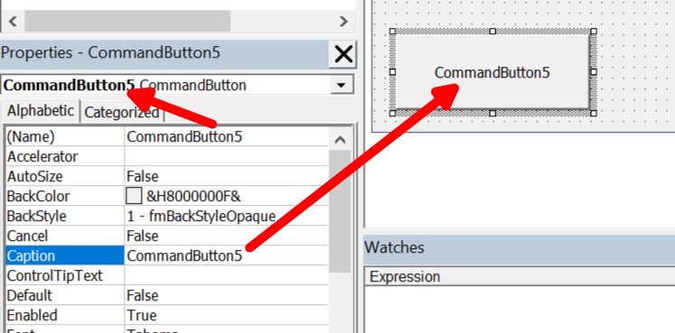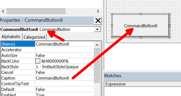 Kada dodajes commandbutton mozes promijeiti name i caption koji se automatski doodaju pri postavljanju.