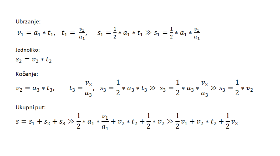 Predmet:Re:ubrzano i usporeno gibanje zadatak mislio sam kod kocenja brzina nam je na kraju 0 0=v2+a3t3 => 0-v2=a3t3 => -v2/a3=t3 a3=-1.35m/s2 deceleracija, kontra od akceleracija |
